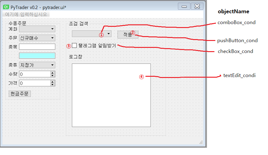 (로그창은 오브젝트 네임이 textEdit_cond 입니다. i는 오타)