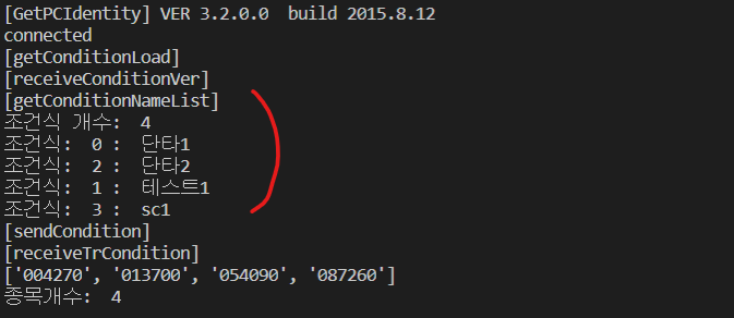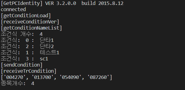 다시 말해서, getConditionLoad() 가 실행되면 OnReceiveConditionVer로 결과를 받고, 그 안에서 getConditionNameList가 실행되며 조건검색식 리스트가 출력됩니다.