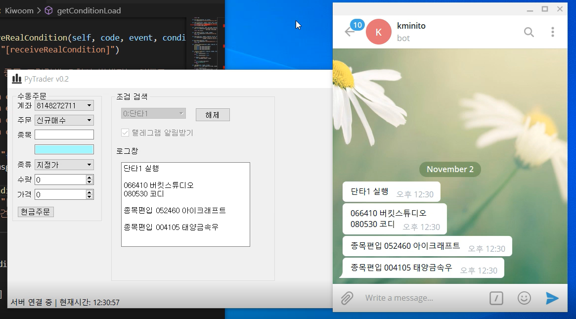 키움증권의 조건검색 기능을 이용하여, 해당 조건을 만족하는 종목이 포착되었을 경우 텔레그램 메시지를 발송토록 하고자 합니다.