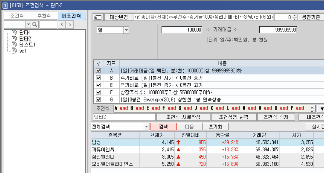 아래는 키움 영웅문에서의 조건검색식 화면입니다 (화면번호 0150)