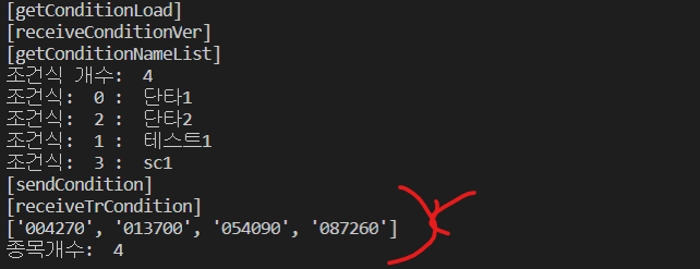 아래는 키움 API에서 콘솔로 저의 조건식 목록을 받고, 그 중에서 '단타2'를 조건 검색한 결과입니다.