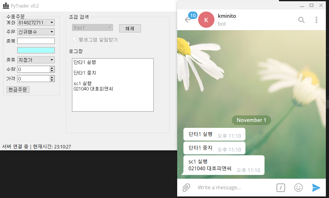 - 조건식의 알림 기능에 집중하여 게시물을 작성하느라 다른 것들이 너무 빈약한 것 같습니다. PyTrader 완성본에다가 조건검색과 텔래그램을 얹을까 하다가, 그러면 너무 복잡해보일 것 같아 일부러 2일차 코드에다가 얹었는데 조금 성의없어 보이는 것 같기도 하네요.