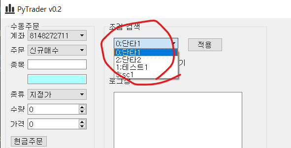 따라서 kiwoom에서 getConditinoLoad() 실행하여 조건식 목록을 kiwoom.condition에 불러오면, 조건식들을 "인덱스;이름"형태의 문자열을 원소로 가지는 cond_list를 만듭니다. 콤보박스에 그 리스트가 나오도록 합니다.