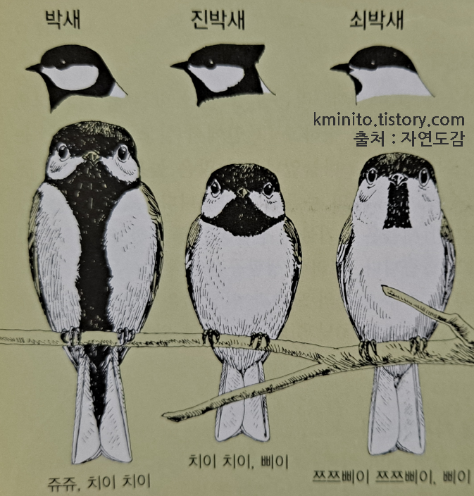 박새, 진박새, 쇠박새는 뺨의 무늬와 턱 아래의 넥타이 무늬 모양으로 구별하는 것이 제일 쉽습니다. 아래 사진을 봐주세요. 집에 있는 자연도감에 좋은 그림이 있어 찍어왔습니다.